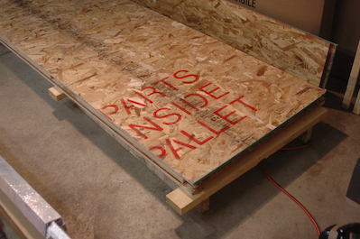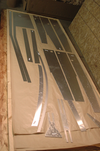 All of the large flat sheet and plate aluminum is packed in several layers between two sheets of particleboard. After inventorying all of those pieces I took the two sheets of particleboard and trimmed them to fit between the legs of my table. I then put furring strips along the long edges. They now would sit on my lower table shelf, one atop the other, and I would have a place for most of the sheets and plate. One level for wing parts and the other for fuselage parts. |