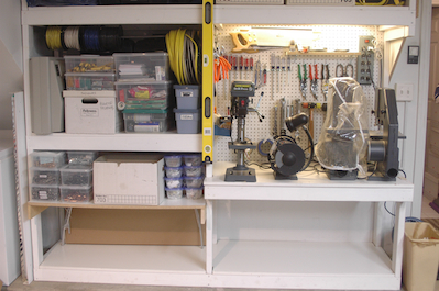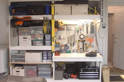 The tail surface skins and canopy rods are stuffed into the lower left shelf in the first picture. The canopy and glare shield remained in the box against the right wall in picture number two for several years. The fuselage forward and aft bottom sheets went into the house with the flat lexan windscreen for long term storage and with that the kit was all put away. The Wicks hardware, rivets and clecos are all on the storage shelves. |