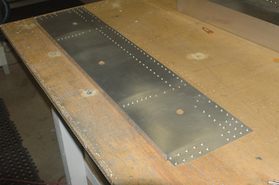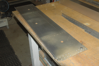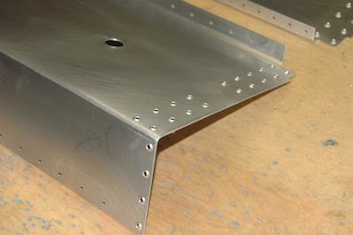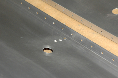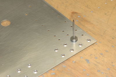 Now all the pieces made out of sheet stock that attach to the countersunk pieces need to be dimpled. The first two pictures show the dimple tool in place. There is an upper and lower die, one on each side of the sheet. By using the rivet puller to squeeze the two dies together you get the raised dimple that fits into the countersink. The remaining pictures show off the finished pieces. |
