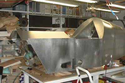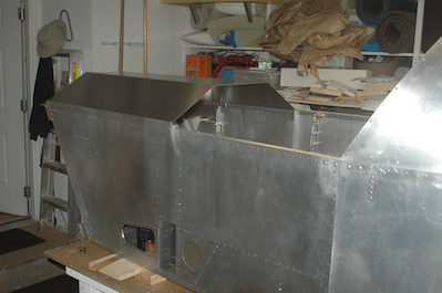 The first picture shows that I did get two bad rivets. The good news was that I first tried to use the pneumatic rivet gun on some and two out of four went bad. I did all the rest with the hand gun with no problems. With the fuselage all riveted together, I let myself reopen the only remaining big box and take out the glare shield. I just set it in place for now and will trim it after I make the seat pan. |