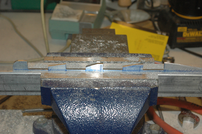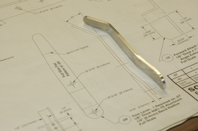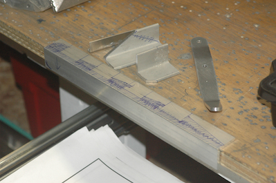 To finish off the fuselage, there are a couple of pages of interior details. One covers the trim lever and its mount, which also is used to control the flaps. These pictures show all of those components. The first picture shows the supplied trim lever. I had to bend it and enlarge the holes to finished size. The second picture shows the angle pieces I cut to length and then shaped. The long angle piece is only marked up in this picture. It is being trimmed in the following pictures. It still needs a little more work but is almost there. |