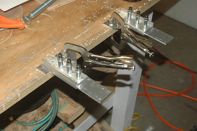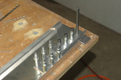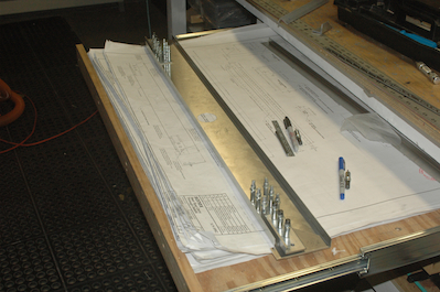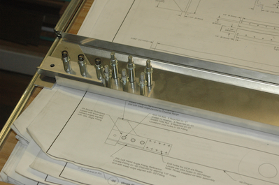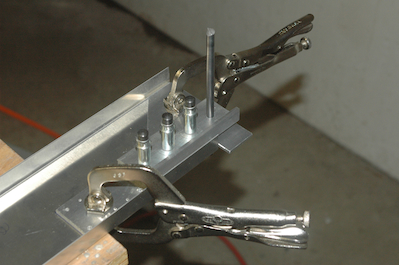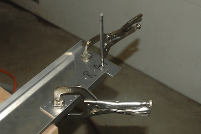 With the new piece ready, I started making up the assembly. Basically the long channel will connect up to the fuselage and rear spar on the wings. The pieces added shown being attached to the channel will beef up the connection to the rear wing spars on each side. In addition, the longer set of angles will attach to the channel, rear wing spar and fuselage sides. All in all the rear spar bolt will pass through 5/8” of material hear. The attachment point is shown by the 1/4” pin that is in place to align these pieces. |