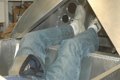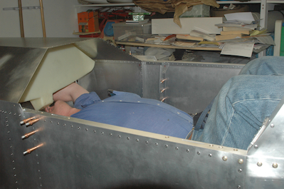 Here is one of the reasons this work has been slow. It is not real easy to work under the glare shield and fuel tank. I first worked under here to trial fit the fuel tank. I had issues with the strap length in the front. To work underneath this time I got some support on the floor. The last picture shows me taking a rest with my head against the fuel tank. That position was actually comfortable! |