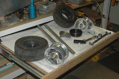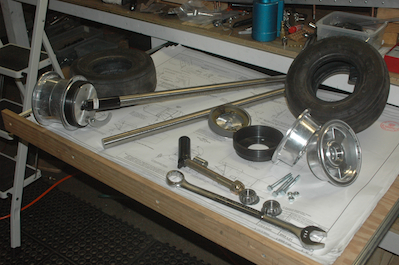 With those minor issues done, I got out all the main gear components. Some of these parts needed prepping. The axle assembly was powder coated and needed to have the protective wrap removed. Like the nose wheel, the wheel halves needed to have flashing removed. Unlike the nose gear, these wheels do not have sealed bearings so I will have to pack them. Also these wheels have a brake drum and brake shoe mechanism. Also on the table are the two titanium rods that are the main gear legs. The tires and tubes that are shown are old and worn. Chris Williams needed a pair but his order was on backorder so I swapped him mine for his new ones when they came in. They didn’t come in! As it turns out, most everybody has run out of them and everybody is waiting for the boat to come in from Taiwan for new ones. Chris let me use these old ones until the new pair arrived (which they did, shortly after I picked these up). |
