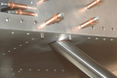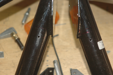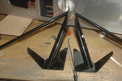 I have been cleaning up a few issues before moving on to the next big and exciting step. What step is that? Sorry, this page first. I showed off all the pieces of the main landing gear in the last post and I have done a few things that need to get done before the gear gets fitted into the fuselage permanently. The first is to enlarge the hole in the fuselage that the gear comes out of to the final size. With the weldments in place, I used them as a guide to file out the edges of the hole to allow the leg to be inserted into the weldment. Then I made a uniform mark around the leg, removed the leg and the weldment and enlarged the hole to the mark. It is a little less than the plans specified 1/16” gap but it is fine. I did both legs. I also test fitted the axle and wheel assembly. I then removed the weldments and the legs. Next I drilled a pilot hole in the weldments that I will use as the starting point for the upper leg attach hole. Again, I am aggravated that the weldments did not have this hole drilled per the plans. In this case, the hole location is specified on the plans prior to the piece being welded. After it is welded it becomes almost impossible to locate the hole as the reference point is welded over. I was able to devise a way to measure, mark and verify the hole location but it was not easy and took a lot of repetition to make sure I was really in the correct spot. |