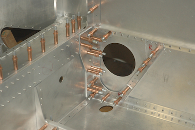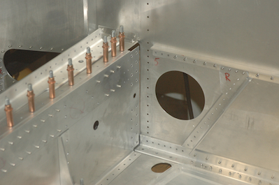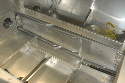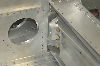 Next up, I disassembled the rear spar tunnel pieces for the last time to clean up the new bolt holes. The first two pictures below, show the bolt coming through from the front side pinning the wings together and to the forward angle on the fuselage. The bottom two show the tunnel pieces going back into position for riveting and bolting to the fuselage. The wings have been removed for this step. |