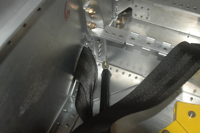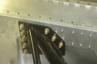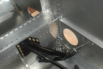 These pictures show the now finished interior. The landing gear weldments have been riveted and bolted in place. In the second picture you can see the countersunk screw heads in the spar tunnel.