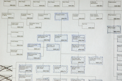 Before starting to fit the vertical stabilizer, I took a picture of the latest updates to the plans. There are a lot fewer boxes to go now and a lot of these will go really fast. The last two pictures show the vertical stabilizer with the rudder attached. The pieces are just sitting in place at this point. It turned out to be quite a job. |