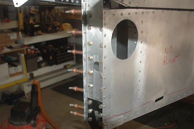 Fitting the vertical stabilizer started out the same way as the horizontal. I had to take it on and off a bunch of times to trim off tiny amounts of skin to clear the fuselage. Although it took awhile, it was very straightforward and when I finally had it clamped in position, I drilled the holes and bolted it all up. The second picture shows the forward attach point all bolted in. Before I could add those bolts however, I mounted nut plates on the back of the mounting plate. There is no access for nuts back there. The first picture below is right after I finished bolting in the rear spar to the fuselage. All these holes had been drilled already and spacers were used in the construction of the aft fuselage section. The spacer are now gone and replaced with the vertical spar. This is however where it turned tricky. The last photo gives a hint of the problem and the solution. I was about to start mounting the rudder when I double checked the movement of the elevator. The elevator still traveled all the way to the down stop but did no longer travel all the way to the up stop! There was interference. Moving the horizontal stabilizer to the aft that small amount raised its head again and caused the drive horn to be interfered with by a small bracket on the spar. That bracket was held on by the two bolts visible in the last picture. Those bolts also interfered with the drive horn travel. In addition the drive horn was also interfered with by the lower edge of the skin! All of these interferences were tiny but they had to be eliminated. To do that however, all those bolts had to be undone and the vertical stabilizer removed. The long and the short of it is that I turned the two bolts around as shown in the picture. I filed the drive horn, the skin and the bracket and eventually got it all to fit just fine. Slowly but finally, all was well and the vertical stabilizer was finally bolted in place. |