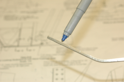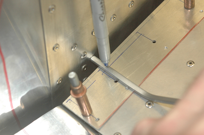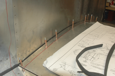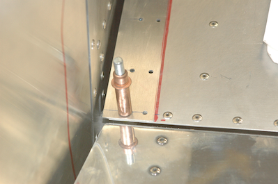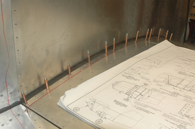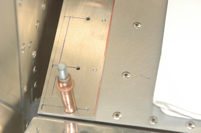 Then it was on to the finish up list. With the wings installed I could finally trim the root doublers. I am installing a rubber ‘h’ channel strip to make a nice seal at the wing roots. I want to leave a 3/16” gap for this to fill. If you remember, I have these pieces temporarily installed offset by 1/2” outboard. So I made a tool with a hole just big enough for my blue marker to fit in and put the hole 11/16” from the end. I then drew lines on both and trimmed off the unneeded material. The last two pictures show the newly trimmed doubler installed in the correct position. The very last picture shows the rubber seal test fitted. |