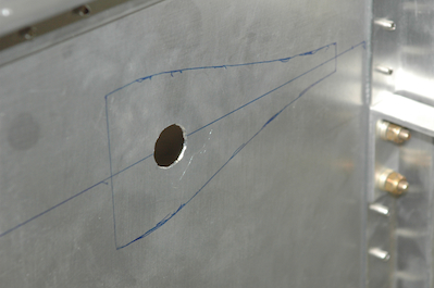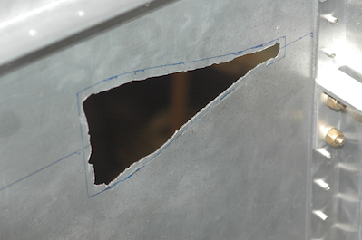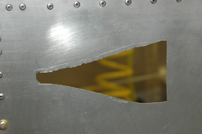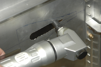 Using the stepdrill, I made a hole big enough for my air driven nibbler to fit and roughed out the shape, about 1/4” from the line. This is the debut of the new nibbler tool. I went to Harbor Freight because they had a sale on an air driven 3" cut off tool for $8!!! I got it and saw the nibbler was also on sale for about $20 and I got it too. I used snips to then get close to the line, and filed the rest of the way. |