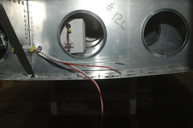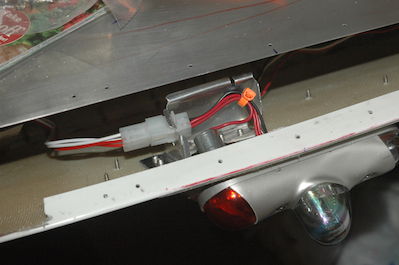 Here is the clip riveted to the wing tip. It supports the connector and the three wires that connect the strobe to their power supplies. The first picture shows the four wires that go into the external clip. They are power for the Nav/Pos lights, their ground wire, a spare power run and a spare ground. The last picture shows everything wired up. |