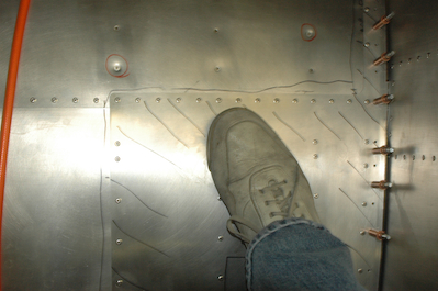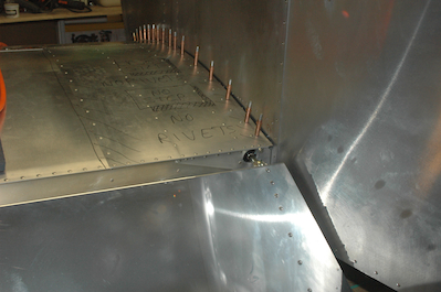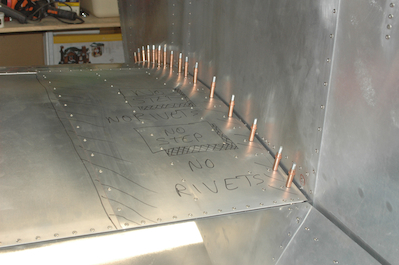 The last of the work done at this stage was to rivet down the wing walk doubler. This was the last march of the clecoes for the wings. Then I became wing walker for the first time on my plane.