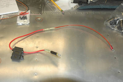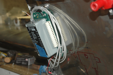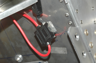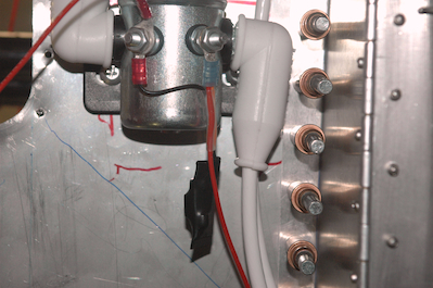 Then add an inline fuse package and butt splice a lead with a ring terminal on it. That ring terminal was temporary for testing and fitting. You can see how it fits in pictures three and four. You will see a lot of tie wraps in the engine compartment. They are all temporary. Any tie wraps this side of the firewall need to be stainless. Also this is hanging loose because it will be supported by the engine mount struts. The fifth picture shows the final ring terminal in place for this lead. It has the crowbar over voltage unit attached. It is hard to see, but one lead from this unit is paired up with the main lead in the blue ended ring terminal. Then all three wires run through a short segment of heat shrink tubing with the black lead from the crowbar device going to the other post on the contactor. This device will essentially dead short the feed when more than 16.5 v is present on the sense post. That will blow the 2 amp fuse in the inline fuse holder. The diode will prevent a reverse polarity hookup. That’s a lot for one little wire to do. The last picture just shows the remounted RDAC. |
