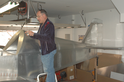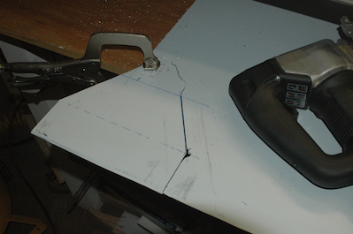 Those two prototype pieces each took about half a day of work. Along with flying on Monday, building the prototypes and a full day of long overdue shop cleanup, I had Joe and his wife down to inspect my plane on Thursday. Joe is EAA 153’s tech counselor and this is his second visit to my plane. We had a great day, a great lunch and swapped model making stories as well. He like the workmanship so I was happy. I had a full weekend so I wasn’t able to get back into the shop until today. I had decided I was going to cut a wood form block to make the piece in .032 material but after a couple of days to think about it, I decided to use .063 material instead. This worked very well. These two pictures show me cutting out a much simpler piece with the saber saw. The second picture shows the nice straight edge it made that cleaned up with the vixen file very quickly. |