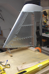 OK, so here are the pictures I promised. Getting here was hard work but this looks like a major aircraft component. These shots are all of the vertical stabilizer with the rudder attached. Just before these shots were taken, I added the final piece to the vertical stabilizer. It is the hinge that holds the rudder. It is held in place by the bronze clecos. Like all three of the previous hinges it is hard to get on and make sure it is straight. It was slow careful work with minor adjustments required during the enlarging of the mating holes to the final size. |