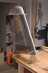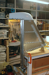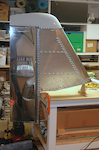 These shots show the starboard side and you can get a better view of the full rudder. For me, this was a special moment. Hanging the finished and polished rudder instantly brought to my mind a feeling that is hard to describe, but here goes. As all who know me know, I love airplanes and have read extensively about them. In particular, beyond my joy in photographing them, I have always enjoyed reading about and seeing pictures of planes being constructed or developed into a real plane from just a design idea. For people who have seen airplanes being built, they have often seem something akin to this photograph, that is, a 'green' nearly finished airplane or tail section with a completely finished rudder attached. A 'green' airplane is called that because, while it is otherwise finished, the outside shell is just raw aluminum or aluminum with a corrosion coating - very commonly green. This is done because, for these planes, the rudders must be carefully balanced and the paint must be taken into account during the balancing. The juxtaposition of the finished rudder hanging from the unfinished airplane is to me always a sign of hopefulness and confidence. Hopefulness because the airplane - or like in my plane the major subsection - is nearing completion and very little stands in the way from ultimate success. The confidence always comes from seeing the tails with the airline logo's only partially visible and knowing that the rest of the painting will go so perfectly that there isn't the least bit of worry about things lining up. Anyhow, here is my 'green' vertical stabilizer with it's polished and complete rudder, ready to move on to the next stage of construction. Sweet! |