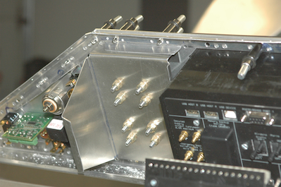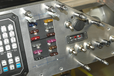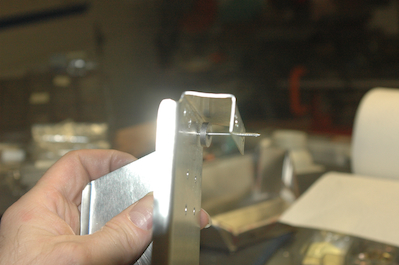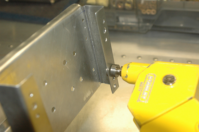 The first two pictures show the panel clecoed in place. These two pictures show a solution to a problem mounting the nut plates with flush rivets. To use the flush rivets I had to dimple the mounting holes, but, I could not get the nail up through the hole with the bottom die. I simple drilled a backing hole larger enough to pass the nail through, insert the die and then pull the nail up into position. It worked great and added a few lightening holes! |