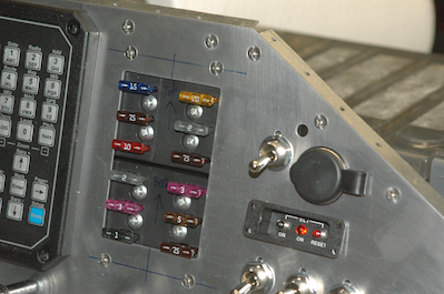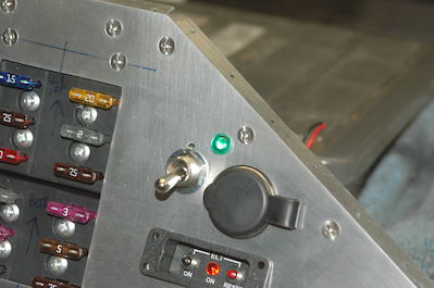 In addition to the nutplates, I picked up some 12v LED packages at Radio Shack that come in colored mounts. These pictures show them installed and the panel screwed to the frame. The last picture shows a now fully populated and complete panel with the addition of the LED’s.