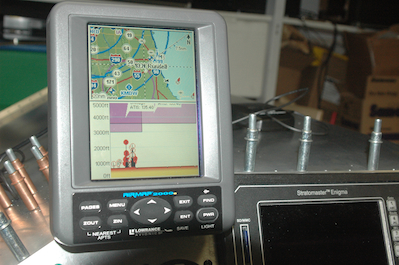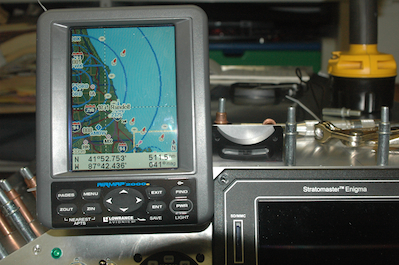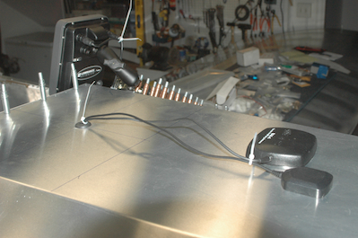 The second picture shows the two GPS antennas in their approximate location. They will be held down with Velcro. The hole is far aft of them because of the tank location. You can see that both an antenna wire and power wire have been routed through another grommet next to the unit. The last two pictures show the mount for the slip indicator and it’s installation location. |