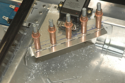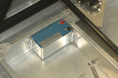 The battery has been mounted in these pictures. Note that one of the hinges is essentially mounted with a hinge pin permanently attached. The other hinge pin will be safety wired. Picture two shows the AHARS mounted but with an additional stiffener. My plan was to use .063ā material at first but I used .032ā instead. I think it would have been all right, except that the stiffening bend I intended could not be done prior to drilling and riveting the piece to the frame. I had to add a stiffener instead. Ideally this should be on the centerline. Iām off two inches but believe this is acceptable. If not, mounting a bracket to this shelf will not be hard. |