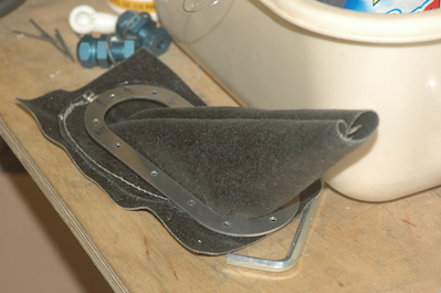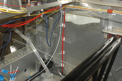 The last wires needing to be run are the wires from the wing connections. The first two pictures show these runs coming up both sides of the fuselage. The third pictures shows all the wires laid roughly in place. The last picture is of a Cessna 152 front wheel steering firewall boot. I will use this instead of making one. It is made of Kevlar and only needs minor trimming to work. I got it from Aircraft Spruce after someone mentioned they used it on their airplane instead of making one. |