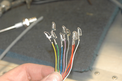 So with every switch wired except one, it was time to make the harnesses for the transponder, Enigma and com. These pictures show the transponder from start to powered up. The first picture shows the back of the tray that holds the transponder. I had to mount this card edge connector first. I numbered the slots for insertion of the pins and then I made the harness. The second picture shows the 10 wire bundle that connects the transponder to the altitude encoder output of the Enigma. So with every switch wired except one, it was time to make the harnesses for the transponder, Enigma and com. These pictures show the transponder from start to powered up.>The first picture shows the back of the tray that holds the transponder. I had to mount this card edge connector first. I numbered the slots for insertion of the pins and then I made the harness. The second picture shows the 10 wire bundle that connects the transponder to the altitude encoder output of the Enigma. The third picture shows those 10 wires inserted into the connector along with power, dimmer signal wire and two ground wires. At this point I had also attached a D15 connector to the other end to connect the 10 wires to the Enigma but I forgot to take pictures of that process. The last picture shows the transponder powered up in standby mode. |