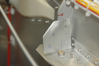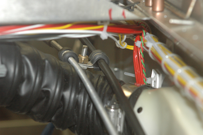 Mixed in with the electrical system has been non electrical work, such as the vent tubing installation. This is because the work is required for closeout of the next step, installing the fuel system. Since these items all come together, electrical or not, the non-electrical items have been commingled with the electrical. The next item up is a case in point. The throttle and mixture controls attach to the panel so they have been worked on side by side with other panel work. I need to have these cables secured and running out of the way from the tank. Starting in the middle of cables, I fashioned a fitting to secure the cables to the side of the fuselage vertical angles. I also clamped them together so that they help support each other. |