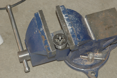 Now to the fuel system. I needed to trim the neck a little so I used my coping saw. It did a nice job. Then I did some tapping and threading! I got a great set of 1/8. 1/4, and 3/8 inch NPT tap and dies at Harbor Freight on sale really cheap. Sonex recommends running a tap in all of the tanks fittings to make sure there is no plastic in there from the molding process. In addition my brass finger strainer had all kinds of crap on the threads. The die cleaned it up and made it nice and shiny. |