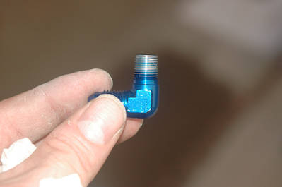 Then I gave the tank a good cleaning inside and out with mineral spirits. The bottom two pictures show a 90° pipe to tube fitting for the vent line. I first installed it to see where it would stop when tight. I needed it to rotate another 180°. No problem with my new set of dies. Since these are tapered, all I had to do was use my die, some cutting fluid and cut it a little deeper. I installed it after checking the new location and it points exactly where I want it. The second picture shows the tank with all the fittings installed. |
