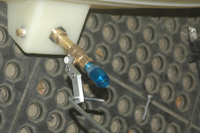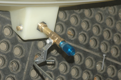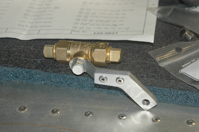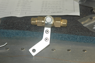 Speaking of the fuel valve, these first two pictures show the valve with a Bob (the idea man) Mika inspired design. Bob ran a rod from his panel to a piece of metal attached to the valve control arm so he could shut off the fuel without having to reach under the panel or use his foot. My attachment fitting differs only in a small way. I only put a 45° angle in the cut out stock instead of Bob’s 90° angle. The bottom pictures show how a rod will fit to push and pull the valve open and closed. |