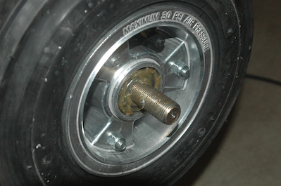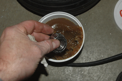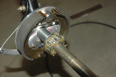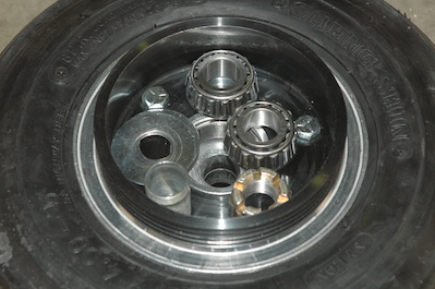 The first picture shows all the components of the wheel assembly. In the second picture, the brake and axle assembly are all finished and a spacer, dust shield and inboard bearing are attached. The third picture shows the outboard bearing just before I start to pack in the grease. The last picture shows it installed prior to putting on the dust shield and axle nut. |