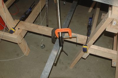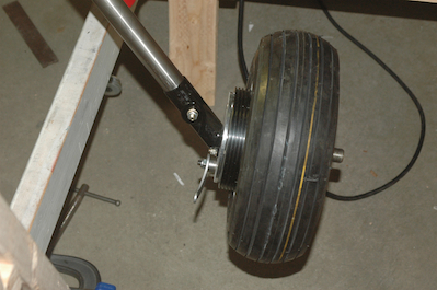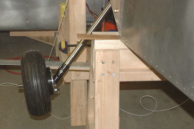 With all of the wheel assembly prep work done it was time to set the toe in and height of the axles. The first picture shows the setup I used. I don’t actually have any pictures of the process but at the point of the picture, I have used a laser level set to the bottom of the scale that is hanging down in the picture. The center of both axles will be adjusted to match this height. You can also see two plumb lines that hang from the same station lines of the left and right fuselage sides. There is a straight edge that has been clamped in front of both axles that is the same distance on each side from the plumb lines. On the inboard side of the axle is a small bushing that comes with the kit that is used in measuring the toe in angle. I raised, lowered and rotated the axle on each leg until the height and toe in measure all came out correctly - (.7°). This angle comes out automatically if you keep the front edge of the axle and the front edge of the supplied bushing the same distance from the straightedge. Then I clamped the axle in place. I did a lot of back and forth and when I was sure both were in the correct spot, I took the same size pilot drill I used on the axle assembly and used that pilot hole as a guide to drill a starting hole in the titanium gear leg. I then drilled out the gear leg and mounted the axles. |