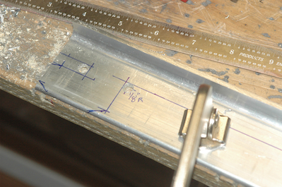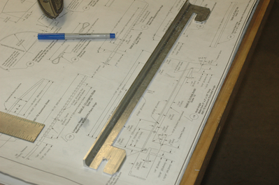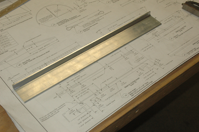 Then I made the locking bar itself. This fits into the two slots in the upper left longeron. Like a lot of the angle pieces that have legs over 1” long, the plans assume a smaller inside radius than the actual angle has. In this case, the piece that will interfere with the radius cannot be trimmed down because it is a square tube and would no longer work. I made a slight modification to the dimensions of this piece to accommodate the real radius. |