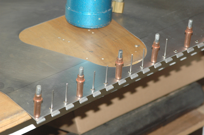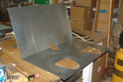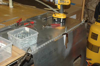 I bent the seat sling after fitting the fore and aft hinges. After bending I riveted them in place. I did not fit or rivet the center hinge at this point however. The next step is the only tricky part. Since the aircraft already has the fore and aft hinges already attached, you can’t follow the same procedure for attaching a second seat sling as I did for the first one. In that instance, I attached the seat sling to the aircraft at the center hinge first and then let the fore and aft hinges fall where they lay. To locate and then attach the center hinge – as shown in the last picture, I placed the seat sling in the airplane attached to the forward and upper hinges and with the center hinge attached only to the airplane. I then marked the location of where the center hinge fell on the seat sling and took it all out and then installed it. |