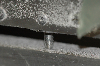 We are then to the finishing touches. The first picture was some sanding of the edge that took place after the canopy was attached. When I first went to close the canopy after it was secured in place, the latch would not slide in and lock because it could no longer get down far enough. I surmise that when riveting the side it pulled the material in tighter than the clecoes and then the plexi protruded just a bit more on the bottom. I could not sand cleanly around the guide pin so I took this picture to show how much of the material got trimmed back before I sanded this bump down. The second pictures shows how I solved a problem. I must have cut my bows a little too short and this one did not protrude down below the aluminum trim piece far enough. The rivet with the aluminum washer under it was supposed to be through the trim piece and into the bow and the steel piece that connects the bow to the square tube. I moved it up and adjusted the location of the inside rivets and simply added the washer. That left the end of the trim with nothing holding it down. I put the rivet below it through the trim piece and the plexiglass. It is simply cosmetic. The last two pictures show the slide handle and lock pieces in the slot cut into the plexiglass. |