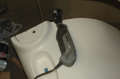 I used my Dremel tool to cut out a semi-circular notch that allows the cowl half to rest against the wooden plate I made. After a quick trial fit, I cut a small notch for the nose wheel strut.