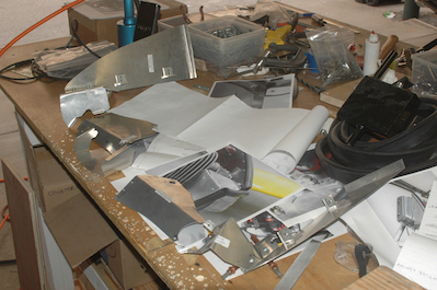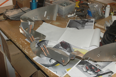 The first two pictures show the front pieces all deburred and ready to be riveted together. They are screwed to the side pieces which are both screwed to the rear piece. The screws holding the rear piece to the engine are visible in the last two pictures, which show the finished base pieces of the baffle. |