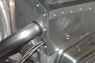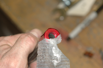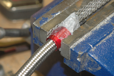 The first two pictures show the rear and side baffle pieces again and this time the right side rear plug wire and CHT wire leads. Note that the intake tubes have been reinstalled. I made a hole large enough to get them through easily but small enough to block with some rubber stripping that will form a grommet like seal. Unseen in the top two pictures is the oil cooler which has also been reinstalled. With that in place it is time to make the oil lines that run from it to the oil pump. After cutting the hose with my Dremel cut off wheel, I feed it into the red hose fitting. The tape around the fitting is just to keep it from getting marred in the vice. It takes some force but it goes in fairly easily. The last picture shows the rubber right up against the inner wall of the hose fitting. |