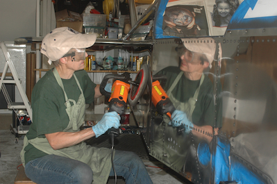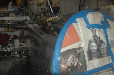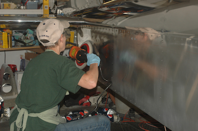 After a good start we kept going on the polish. In the first picture, I have done the upper half of the forward end of the turtle deck. The lower portion of the forward end of the turtle deck was not done yet. Kathy worked the turtle deck from the rear forward to meet me. The turtle deck has the F9 passes completed in the second picture. Kathy then worked the lower part of the aft fuselage while I did the forward fuselage. In the last picture she is finishing up the aft fuselage and is reflected in the forward fuselage section I did. This was the end of F9 on the Fuselage. On to the C grade of compounding and then the S grade with the orbital polisher. |