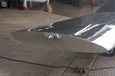 It’s been three weeks since I was able to put up the last post on moving to the airport. That post was as enjoyable to write as it was to actually do the move. The intervening three weeks have been no less enjoyable even if I couldn’t share many pictures. It seems it was repair time for the computer I use to produce these logs. I also hit a pothole going to the airport one morning and later discovered that it bent my wheel. The tire somehow managed to hold pressure but it was not safe to drive it. Since my computer was considered ‘vintage’ it turned out to be a slow process to get it fixed. Likewise my car. Cadillac had none in stock and had to find one. These caused some minor scheduling problems for me but I was able to work on the plane just fine. I did post some text updates on my blog to keep everybody informed of my progress, which has gone really well. I also managed to get a trip to Oshkosh in so I couldn’t be happier. It has been very different to not have the plane in the garage. I have had to plan my work sessions to a much larger extent then I did at home. It has also taken time to organize a usable shop at the hanger. I went from knowing where every tool and part was to barely being able to find a wrench. Not to mention the inevitable need of a part or tool that was not at the location I was at, including paper documentation. Mostly that is all behind me now so here in a nutshell is the last three weeks of work. The first picture is the first day back at the airport after the move. Kathy came with me for some of the early sessions until I no longer needed a hand. She has moved on to her upstairs renovation project but will come out whenever I need her. The second picture is after I finished up tightening and cotter keying all of the wing nuts. It would be one of the last times I would have this view since the aft bottom skin could now be attached. Next up I connected the wiring harnesses to the wings and tested the wing tip installation. All was well, so I riveted the wingtips on and the wings were finally closed up. I used aluminum rivets so that it will be pretty easy to remove the wingtips should I need to. |