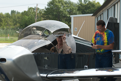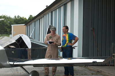 After a lot of fretting over the details I was ready this morning for first flight. Kathy came with to do the photography and Chris Williams flew over to be my ground crew. I am reviewing my checklists and flight plan with Chris in the second picture. After Chris gave the plane one last walk around - and I was all strapped in - it was time to go. |