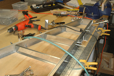 Starting to attach the ribs. They all went in with little difficulty. The second shot shows a rib that attaches to clamps. I use one of my new dogs to clamp to it and hold it at a 90° angle while I position it and then clamp it and drill it.