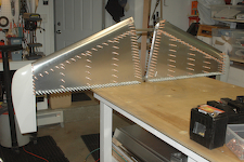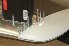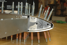 Lots done, but still lots to go on the Horizontal Stabilizer. Picking up from last time, here is a shot with both surfaces pilot drilled and clecoed in place. The leading edge pulls nicely to the rib. The rib tips are also in place but not trimmed yet. These two shots show the piece after all the pilot holes are drilled and then after all the pilot holes are updrilled. Note the bottom row of silver clecoes. These holes will not be updrilled until attaching the hinges for the elevators. |