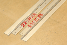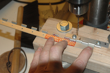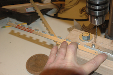 I started with the hinge halves. Since I will use my hinge drilling jig, I have to mark a two inch area that will not be drilled using the jig. There is a special pattern in that area. The other 35 holes in each hinge piece are drilled in the jig. Here is my drilling jig in use. From the time stamp on the pictures, it took about 8 seconds per hole (about 70 on two pieces) a real time saver. The last picture is the finished hinge halves with the special pattern drilled. |