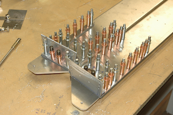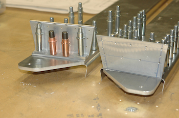 Continuing with the rear wing spars… …getting all the pieces in place and then updrilling to the final hole size. Notice on the ends with the thick flanges that the construction is different for each side. One reason is, for simplicity, the Sonex ribs are all the same for both wings. They don’t make left and right ribs with a different direction of bend. The forward facing flanges accommodate this by facing different directions. Also because the wings just cross in the fuselage, one wing is slightly ahead of the other. The attach fitting mounts forward of the channel on one to help accommodate that. |