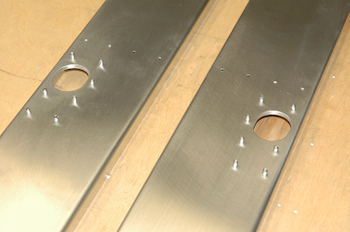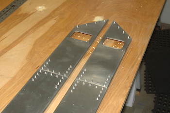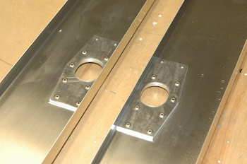 The outboard end of the rear spars have a square hole for the aileron balance arm, a splice plate to join the two pieces if you don’t make it from one extra long piece of channel – the kit comes this way – and a clip at the very end for mounting the outboard rib. This hole – with the reinforcing plate - is for passage of the aileron control rod. |