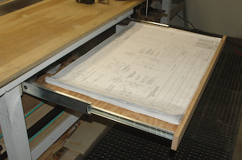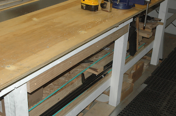 It became obvious that working with the plans while building the larger structures was going to be a problem. When I built the table, I had thought about putting in a plans drawer but decided to see how much room there would be after the kit arrived. There wasn’t enough room so I decided I would wait. Now that I have used a lot of material from the bench storage area, there was enough room for a plans drawer. Here it is. (It would have been a lot easier to put it in from the start! I also made a new jig to help cut the pieces on the next few pages. My compound saw lets me cut from 90° to 40° in either direction. The jig allows me to cut angles less than 40° up to 8” long. I have a really nice non-ferrous metal cutting blade in the saw and it has worked great on all the angle stock. |