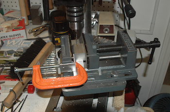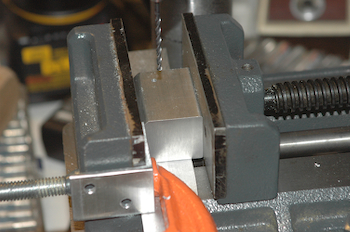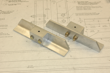 Picking up where I left off, I have to make four assemblies from the pieces on the previous page. They are the four wing attach assemblies. Each one has one of those solid blocks of aluminum I cut out earlier. Each block needs three holes drilled. These are very important holes that I want square and to size with a nice tight fit. My old vice is mountable to a drill press. I got it into position and added a stop to be able to drill all of the blocks the same. There are two holes that attach the block to an angle. They are symmetrical along one axis, so I drill one hole then flip the piece over and drill the second hole in the same block. Then repeat for each block and do it again with the next size up drill bit. Then position for and drill the vertical single hole, updrilling it as well. I started with a 3/32 bit and stepped up by 1/32 to 3/16 for all the holes in the un-mounted blocks. Then I had to mate and updrill the two horizontal holes to 1/4”. I then cleaned up the pieces and finished these two assemblies below. I still have to updrill and assemble the other two. |