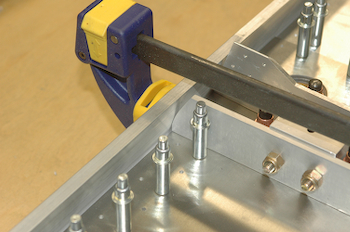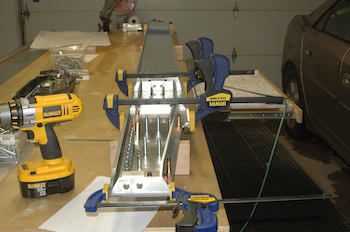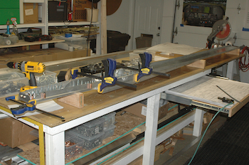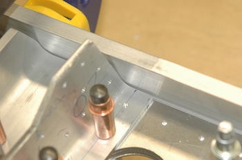 Yesterday I finished adding most of the pieces I made that get attached to the spar web. That entailed drilling through the web pieces, but only through existing pilot holes. If I made a mistake the webs would still be usable, although I might have to remake the piece I was attaching. I was still very careful and it took a long time to double check and verify the position and stacking order of every piece, including making sure I accounted for Left hand and Right hand differences. Today was even more exciting. I clamped up the kit supplied spar caps and then had to make them ready for drilling. If I had them on wrong or in the wrong position, once I started drilling there was no saving them if I had it wrong. Lots of measuring, re-measuring, comparing the drawing to the piece, deciding which holes to drill for now and at what size and then deciding to go ahead and drill. I ran into my first difficulty before drilling when I test clamped the spar caps. There were a couple of minor clearance issues with three pieces. In the two pictures below you can see two angle pieces after I took them down a hair for clearance. I simply rounded off the sharp angle with a quick press on the Scotchbrite wheel. |